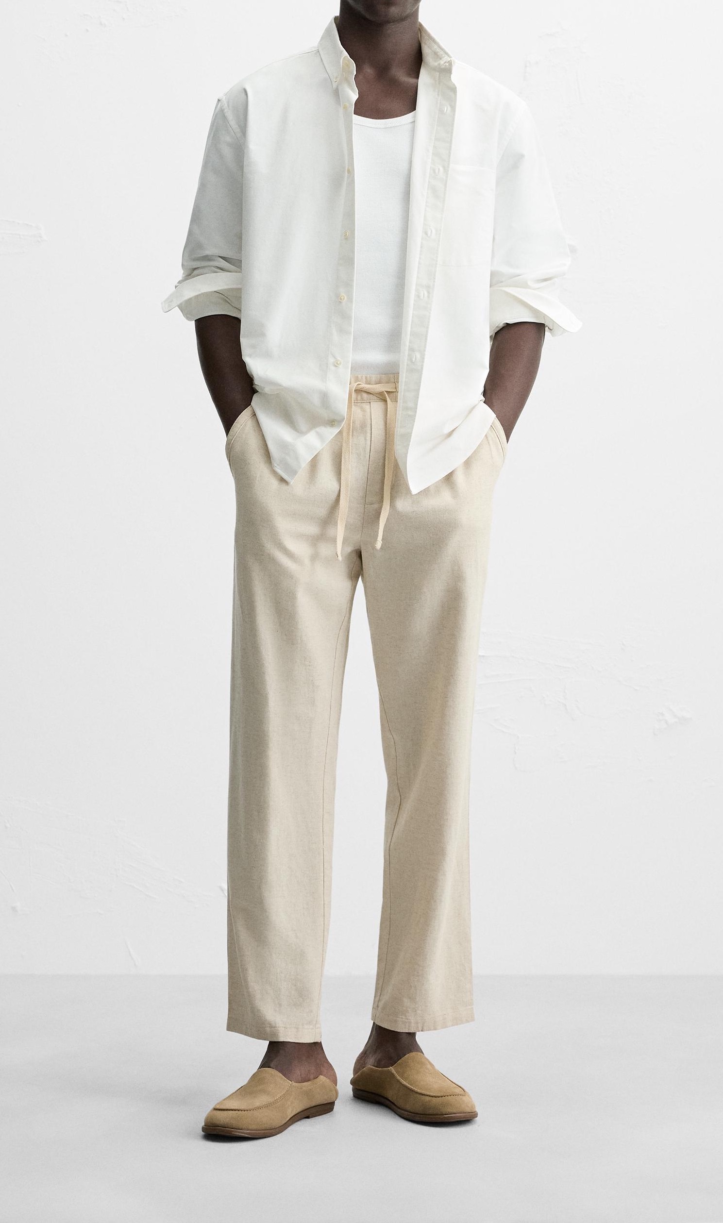 Trousers made in linen fabric. Elastic waistband with adjustable drawstring. Side pockets and patch back pocket detail. Front zip and button fastening.